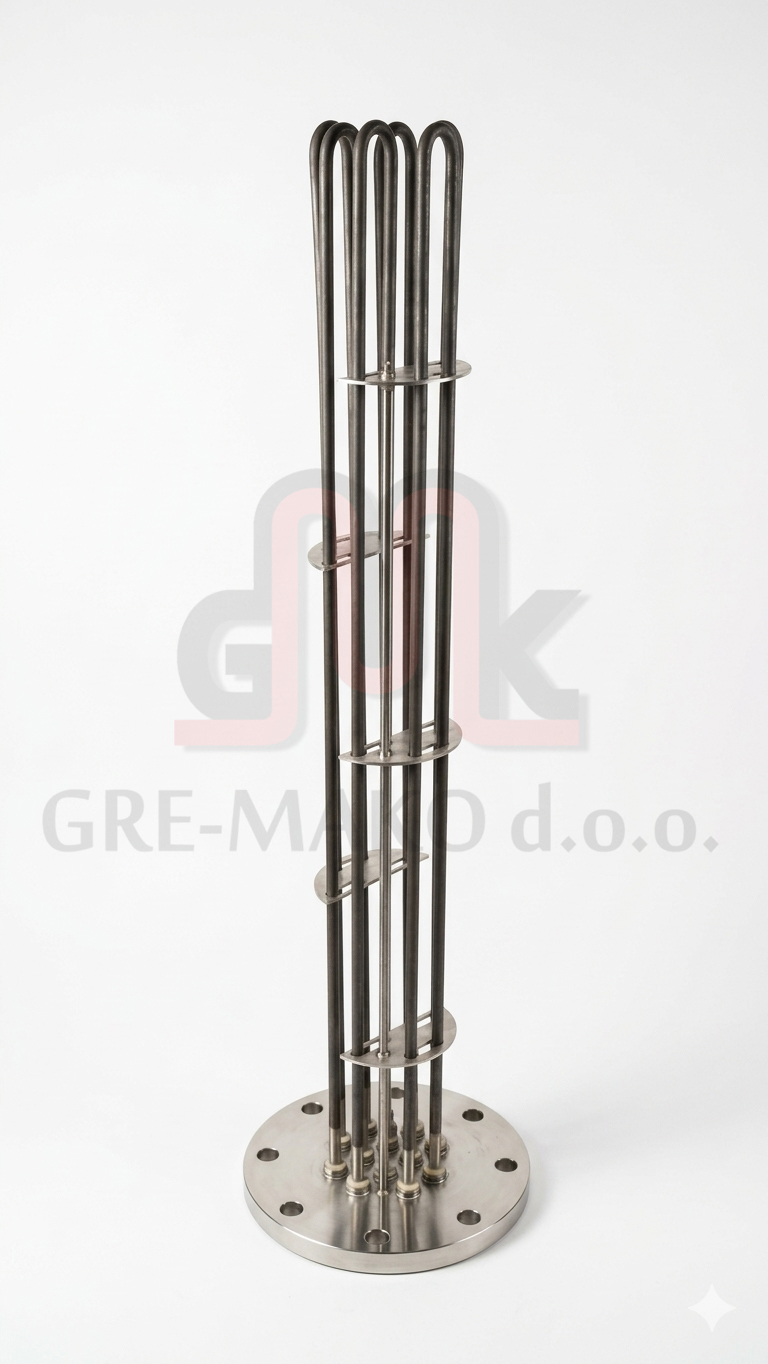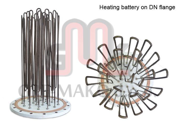 We produce heating batteries on DN flanges in thicknesses of 6.5mm and 8.5mm. The tube material is selected depending on the power, temperature and conditions in which the heater will operate. The shape and method of attachment are adjusted to the customer's wishes.